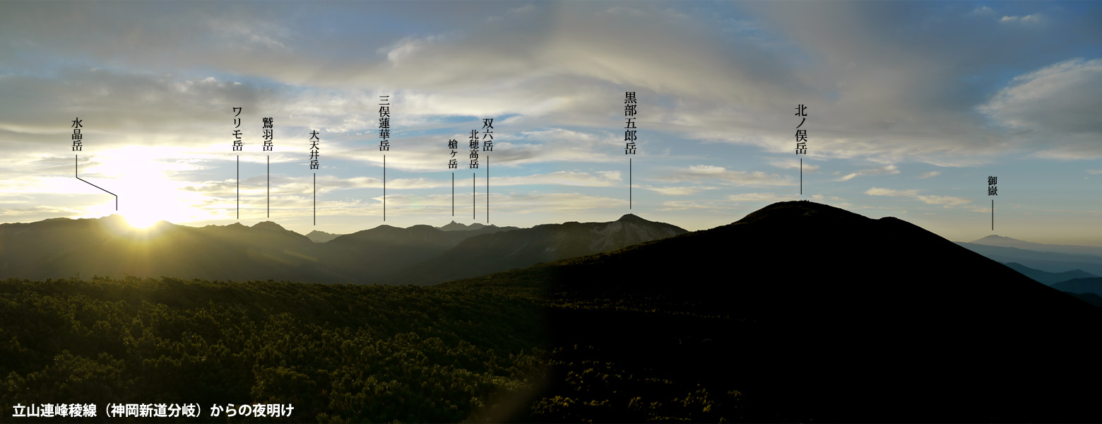 やっぱり北ノ俣への登りはきつい。ようやく稜線に辿り着く。ちょうど水晶岳から日が昇る時だった。ちょっと雲が出ているが、うまい具合に朝日が顔を出している。この高度でこの時間なのにほとんど寒さも感じない。