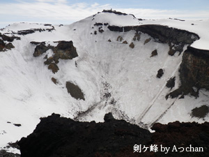 下山は滑落の危険性がないバサバサ雪斜面を尻セードするが、思ったよりスピードが出ないどころか摩擦で止まってしまう。トレースとシュプール跡をたどりガンガン降りていくが、ここでもまたアホさ加減を露呈することとなる。すでに須走下山道を行くことを忘れているだけでなく、シュプール跡が吉田口に下りていったと気付く頃には須走登山道からも離れていたのである。崩れやすい溶岩尾根を越えて方向を修正し、なんとか登山道を見つけ下山し始めた頃にはガスが出てきた。
