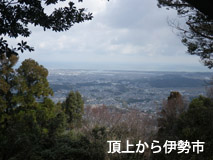 ほどなく山頂に着く。山頂はちょっとした広場になっており三角点と立派な標識がある。北面に展望が少し開けており、伊勢市内を経て伊勢湾が望めるが視界がさらによければ海向こうに愛知県も見えそうである。
