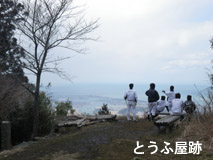 朝熊峠に着くと視界が広がり、とうふ屋旅館跡の展望台からは二見浦方面が良く見えて癒される。戦国村のワザとらしい城まで見える。少し息をついているとすぐにトレーニングの野球部員たちも到着して「綺麗だ~」と歓声を上げている。腹が減ってきたので先を急ぐが、とうふ屋旅館の説明書を読むとケーブルカーの廃止(第二次大戦に鉄が足りなくなりレールを持っていかれたとのこと)に伴ってすたれてしまい茶店としてやっていたが、昭和39年の火事で焼失してしまったとのこと。