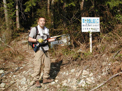 宮奥林道を奥へ奥へと進むと、小さな登山口が現れます。周りには車は無く、我々が一番乗りのようでした。低山とはいえ、冬期のまったりトレッキングから久々に高い山に登ります。天気は絶好の晴! 木村さん既に半袖です。