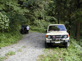 国道156号を平瀬に向かって北上しますが、今はバイパスができているので平瀬の街中に入る必要はありません。バイパスから林道に入るとすぐにダートに。登山口目指して行けるところまで行こうと思ったら、これまたハードな上り道で、パジェロは四駆じゃないと登っていかない始末。木村さんのプロボックスも腹を擦りながら何とか進んだものの途中で動かなくなり、仕方なく途中の路肩に駐車して出発しました。