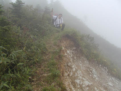 崩落地をのぞき込む木村さん。どうやら頂上まではあと少しのようです。最後の力を振り絞って頑張ります。しかし、この狭い登山道。一歩間違えば地獄の底です。十分に休憩を取ってから再度出発します。