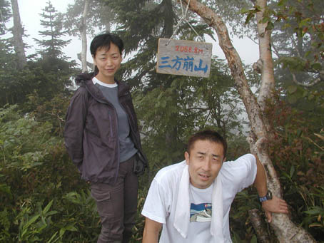 遂にやって来ました。三方崩山のてっぺんです。フラフラの木村さんと御澄まし顔のトモちゃんです。しかし、トモちゃんも連続ピークには相当参っていたようです。いつもの登山以上に、山頂に立てて良かったと思わずにはいられませんでした。それにしても木村さんの根性には脱帽です。