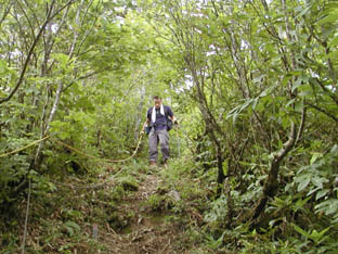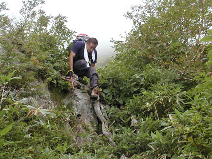 さあ、今度は直登の下り。岩場が少なく、足を掛けるところが無いので、トラロープが頼りになります。