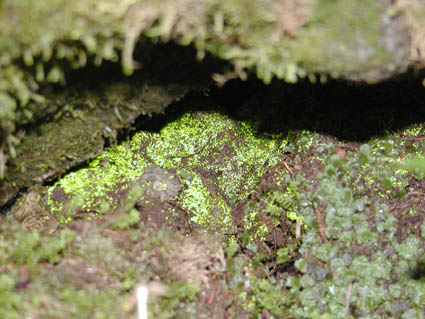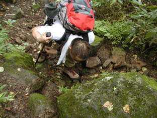 岩と地面のすき間にヒカリゴケを見つけました。確かにキレイに光っています。改めて登山道の脇の岩の影を覗いてみたら、至る所に見つかりました。写真でも光っているのはわかりますが、実物はとてもキレイです。