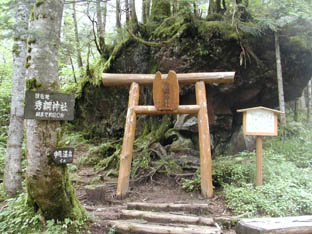 こんな山の中に神社があるとは。この岩の下にもヒカリゴケを見つけました。
