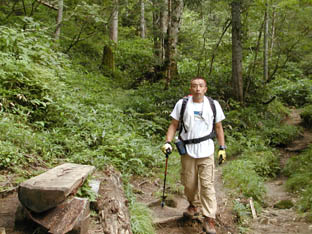 白水の滝を眺める木村さん。登山口まであと少しです。